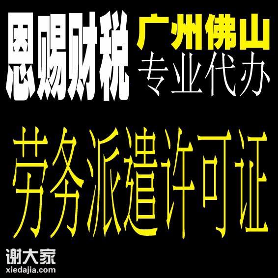 广州劳务派遣许可证:广州恩赐财税策划有限公司主要经营:代办广州劳务派遣许可证、广州人力资源服务许可证、广州道路运输经营许可证办理、广州汽修二类许可证代办、广州汽修三类许可证办理、美术著作权登记一系列专业服务,佛山公司注册、佛山代理记账、佛山税务筹划、佛山代办营业执照、广州公司注册、佛山写字楼出租、佛山物业管理、代办广州广播电视节目制作经营许可证、代办广州危险化学经营许可证、商标注册、商标变更、商标续展、商标转让、商标补证、商标许可、知识产权业务代理,我们的宗旨是为您量身打造企业服务的税务与知识产权保护方案。由于劳务派遣的“临时性、针对性和专业性”特征,劳务派遣在我国很普遍,有劳务派遣业务的企业很多,而法规规定,有劳务派遣业务的企业需要申请办理《劳务派遣经营许可证》方可开展业务。