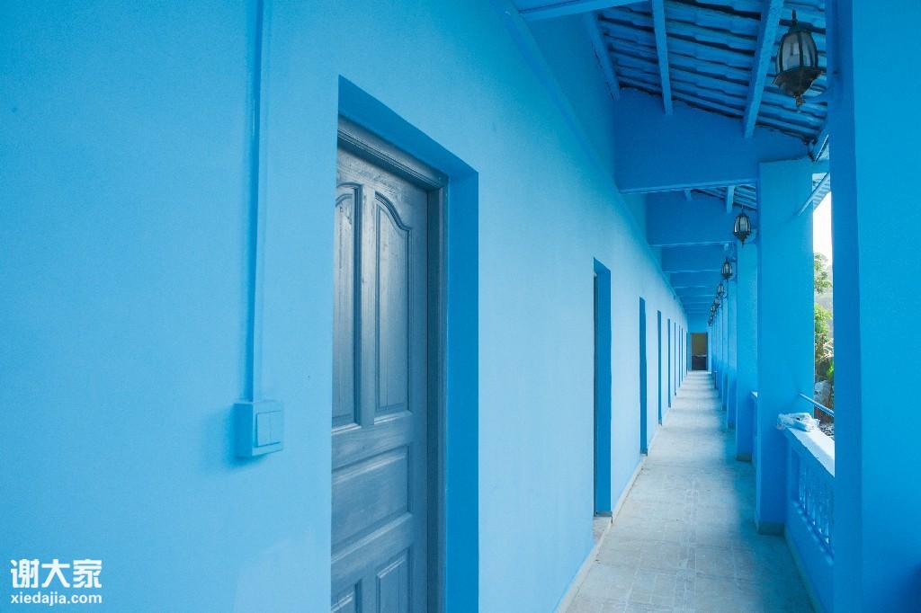 住房外面被一层一层蓝色覆盖,在阳光的照耀下与天空相结合。五颜六色的轮胎成了其中的点缀。