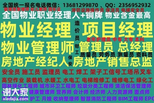 连云港哪里考物业职业经理人园林绿化养护项目经理物业项目经理考试电工焊工叉车高空作业 连云港哪里考物业职业经理人园林绿化养护项目经理物业项目经理考试电工焊工叉车高空作业 物业经理、项目经理、物业管理员、物业总经理、物业管理师、物业职业经理人+铜牌每周二周四报名上交资料需要添加梁老师微信 大专、本科、物业公司物业经理项目经理物业职业经理人物业管理师报名要求报名咨询梁老师考试时间取证时间报考费用报名咨询梁老师,一级智能建造师、全过程项目管理师、工程总承包(EPC)项目经理报名咨询梁老师、建筑工业化应用工程师、碳排放管理师、 BIM工程师、装配式工程师报名咨询梁老师、会计证、会计师、卫健委颁发医院护理员报名咨询梁老师、心理咨询师、健康管理师报名咨询梁老师、公共营养师、人力资源管理师报名咨询梁老师、经济师、社会工作师报名咨询梁老师、政工师、收纳整理师、短视频运 营师、智慧消防工程师、装配式BIM工程师、机电工程师报名咨询梁老师、电气工程师、监理工程师、网络安全管理师报名咨询梁老师、安全工程师、应急安全管理工程师