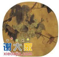 其中吴旭最喜欢的是《葡萄草虫图》。葡萄累累垂挂,蜻蜓、螳螂、蝈蝈、蝽象伏于藤蔓绿叶间,画家以小幅的画面抒写了一幅生机盎然的田园景致。昆虫以双勾填彩法绘制,用线刚柔相济,既准确地勾勒出秋虫或动或静的各种体态和神情,又将昆虫翅膀的轻薄或外壳的坚硬等不同的质感表露无遗,显示出作者敏锐的观察力和精于细节表现的绘画功底。在色彩上,敷色轻淡,深得造化之妙,葡萄藤的藤尖点染红色以示其新生初发之嫩,叶子的边缘略以褐色渲染,表明叶片饱经浓霜重露之貌。这种合乎自然规律的晕染与其求实的线条相得益彰,具有宋代院体工笔画的鲜明特色。