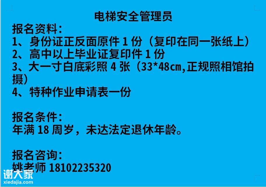 广州报考电梯安全管理员,到广州铭智找姚老师,我们常年开班,每月有3班,考试班次密,发证速度快。正规培训考证。